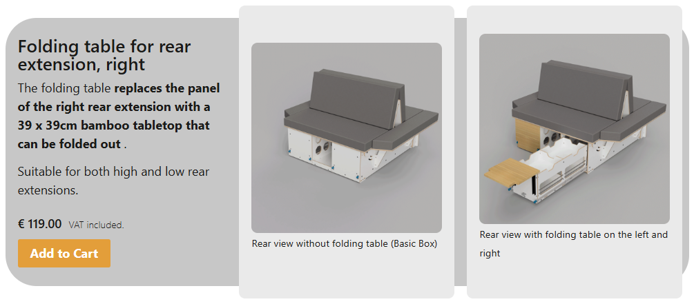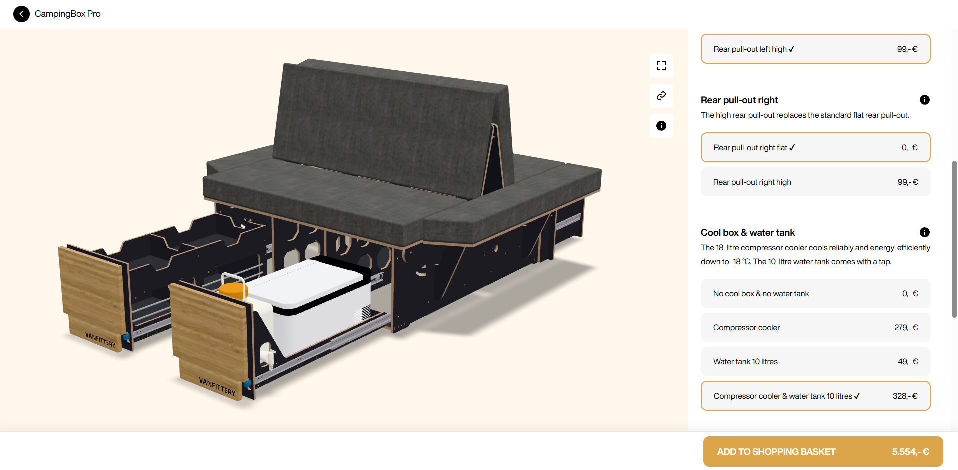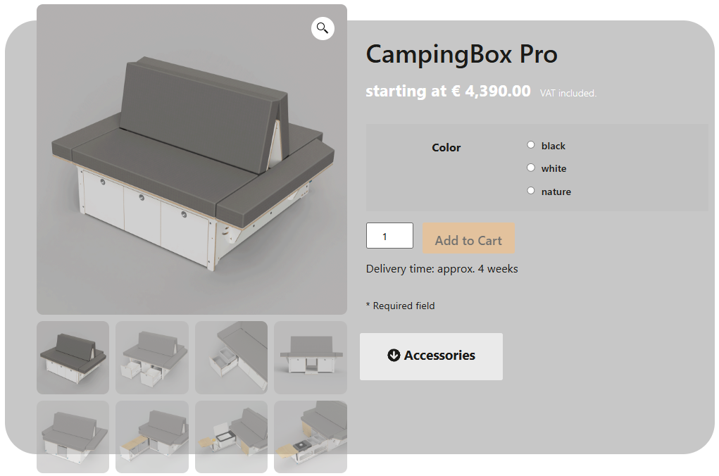 Hi everyone, this is Niklas from Vanfittery! We create modular camping solutions that fit into various vehicle types. They are highly customizable and allow customers to configure modular products, based on a base product with optional add-ons. This offers maximum freedom, but the products have many different possible combinations (one of our bestsellers, a sleeping system for vans, has over 400 possible variants).