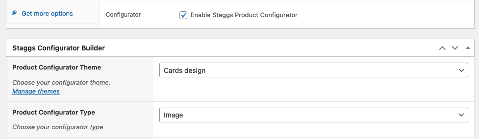 Go to your attribute and make sure ‘Modify product image settings’ is set to ‘Yes’. You will now see the options as displayed in the image above. In the ‘Image Layer Order’ field, fill out any number you like. Higher numbers will be placed on top. So your bottom layer is ‘0’ and your top layer is ‘100’ for example. Validate the configurator theme settings The Staggs product configurator plugin supports two types of previews: Single image preview and Stacked image preview If you don’t see the expected behaviour, please make sure you have a theme linked to your configurator builder and the theme setting is set to Stacked image preview. Make sure configurator theme is linked Go over to your configurable product page and look for option: “Product Configurator Theme”