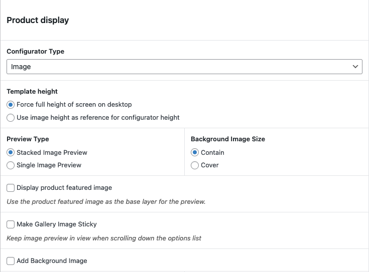 Finally check the following settings: Configurator type: Image Preview type: Stacked image Version 2.x Go to Staggs -> Templates and select your template In the “Template” tab, check the “Configurator type“. In the “Gallery” tab, check the “Preview type“ Well done. You should see your stacked product images in place now. If you have any questions, feel free to reach out to our support team.